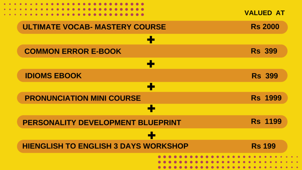 Valued at Rs. 1999/- Pronunciation mini course एक ऐसा course है जो आपके pronunciation को बेहतर करने में आपकी मदद करता है और आपकी English को next level पर ले जाने के लिए एक map की तरह काम करता है । यह video course की कीमत Rs.1999 से भी अधिक होती है। but अभी इस कोर्स में enroll करने आपको यह फ्री मिलेगी।